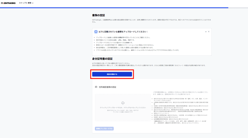 書類を提出するメイン画面です。まずは「身分証明書」と「住所確認書類」の画像ファイルを準備して、「認証を開始する」ボタンを押しましょう。