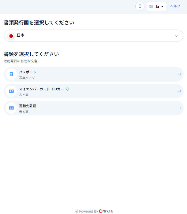 このような画面になるので、書類発行国は「日本」身分証明書は「パスポート・マイナンバーカード・運転免許証」から任意のものを選択してください。