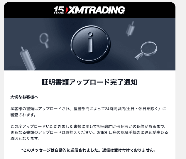 証明書類の提出後、XMTadingから「証明書類アップロード完了通知」というメールが届きます。正しく受理された控えとして確認しておきましょう。