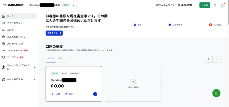 審査中のXMTadingのマイページはこのようになっています。