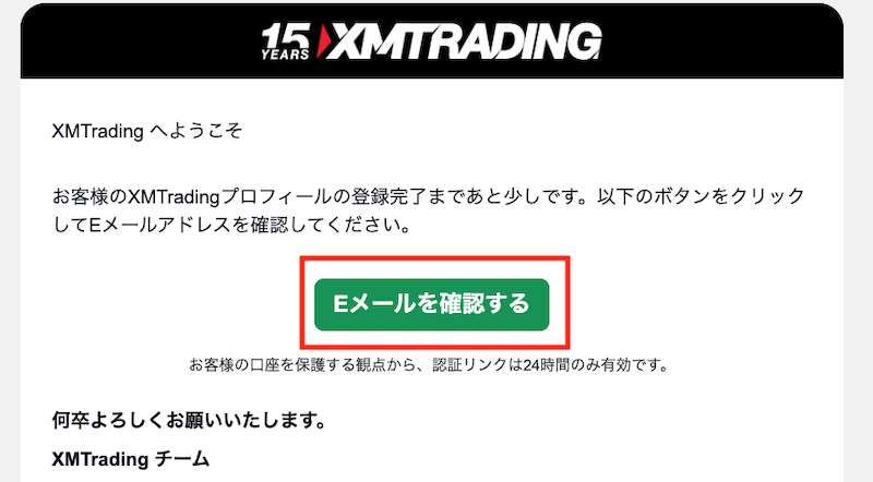 すべての項目を入力して送信すると、登録したアドレス宛にXMTadingから「Eメールアドレスをご確認ください」というメールが届きます。