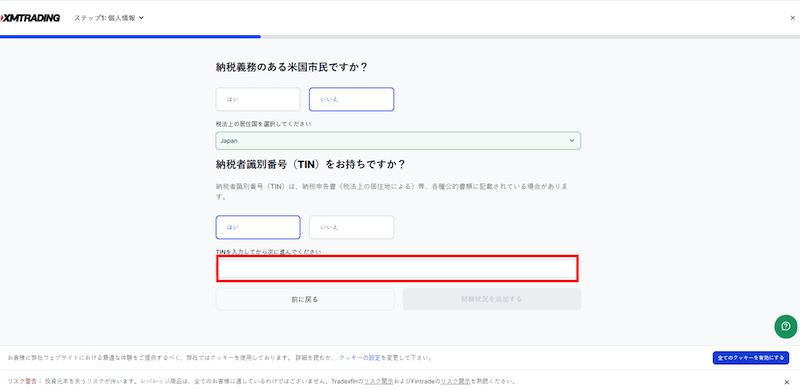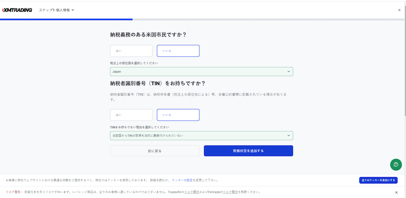 次はXMTadingへの納税情報の確認です。「米国市民(米国籍・米国居住者)ですか?」という確認項目がありまが、日本在住で日本国籍の方は、必ず「いいえ」を選択してください。