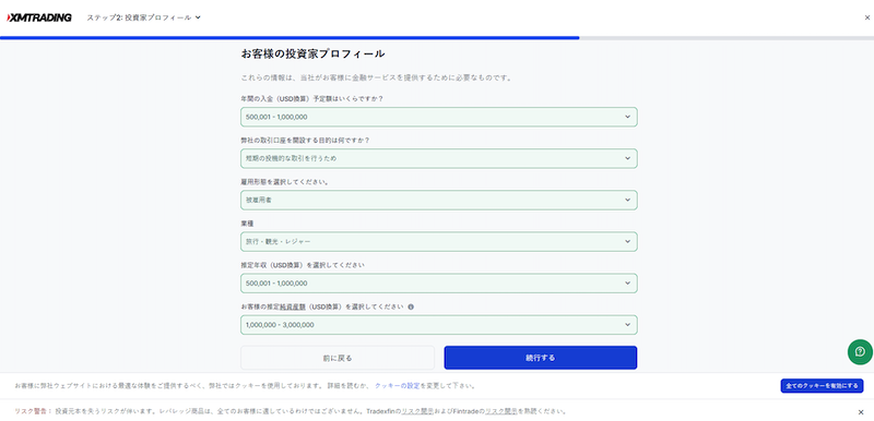 次に、年収や資産額、投資経験などXMTadingからのアンケートに回答します。以下の項目をリストから選択してください。