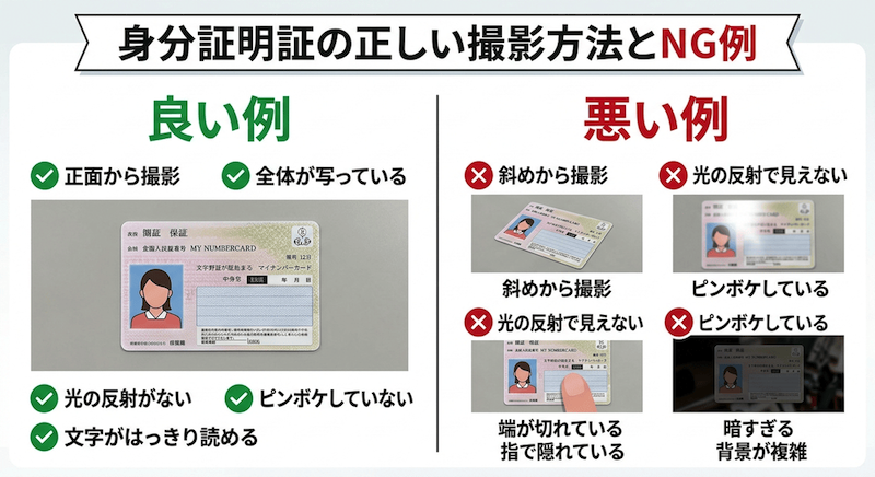 書類の画像が不鮮明だと、再提出が必要になり有効化までに時間がかかってしまいます。撮影時は以下のポイントに注意してください。