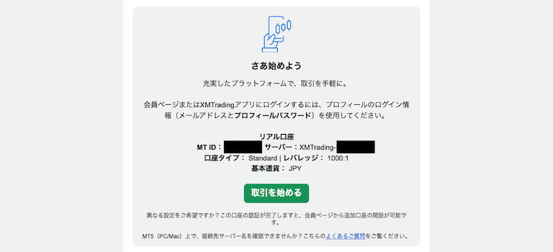 取引ツールのIDとサーバー名は、口座開設完了時にXMTadingから届くメールに以下のように記載されています。必ず控えておきましょう。